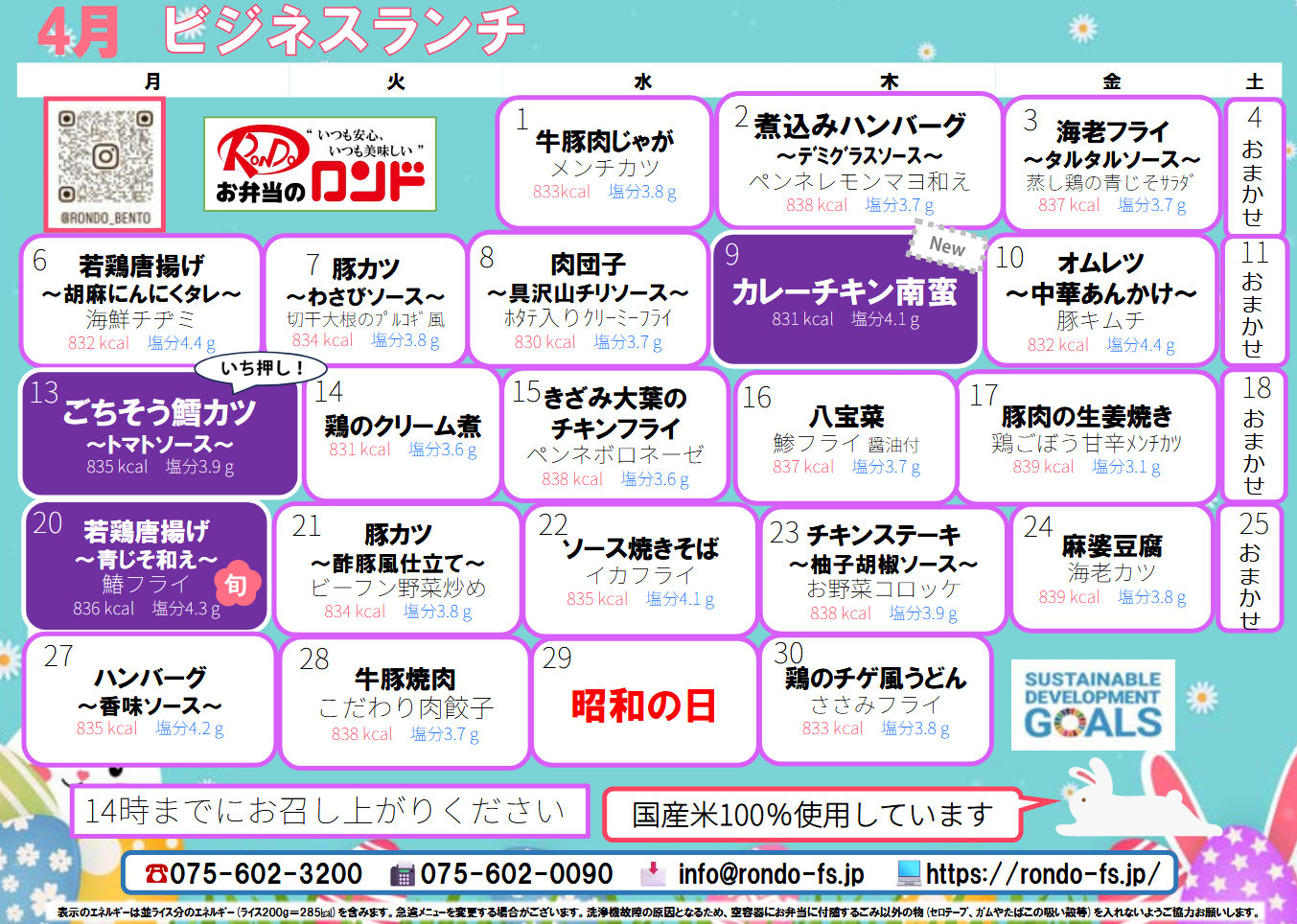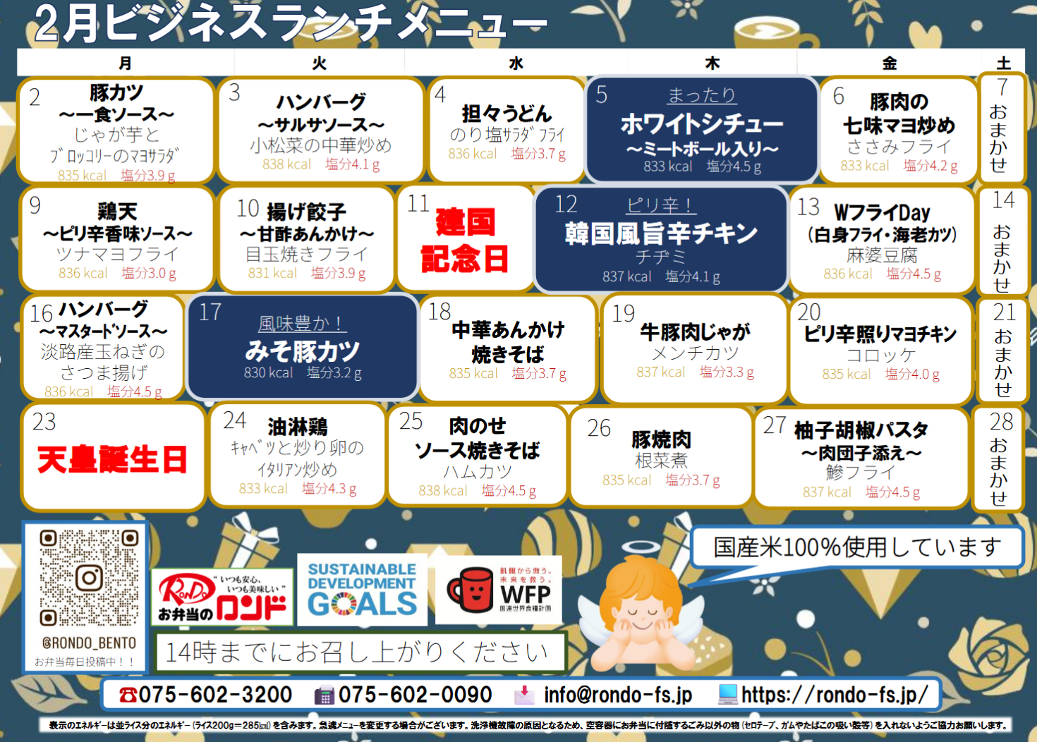 土曜日・日曜日は、手料理です。平日は、1品程度追加で手料理を行い配食をメインとしています。